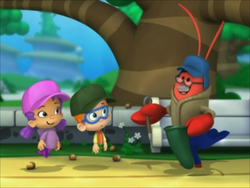 Mr. Langoustine is a character from Bubble Guppies. He is a lobster who only appears in "Boy Meets Squirrel" He loves to read the newspaper and recycle the park for the Bubble Guppies. He has a very grandfatherly personality.
