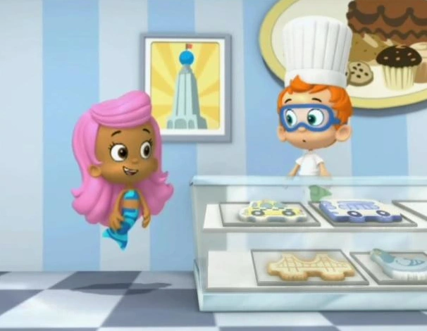 In class, they ride Mr. Grouper like a bus. They see Gil, the bridge builder, and Deema, the President. Oona is at the Bubble Building, working as a traffic guard, which Clam comments on. Mr. Grouper then informs the Guppies that they will be going on a field trip to the city later in the day!