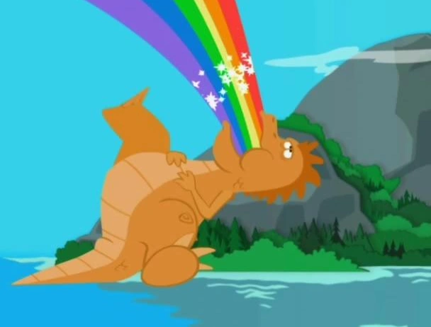 Before long, the Color Monster came back yet again for more colors, and Deema finally had enough. "Hey, Color Monster!" she shouted, "Leave those pipes alone! You're drinking up all the color in the world!" The monster sadly explained that those were his favorite colors. Deema asked which ones, and the monster responded, "Every color of the rainbow." This gave Deema a brilliant idea, and she urged Nonny to activate the Emergency Rainbow Generator.