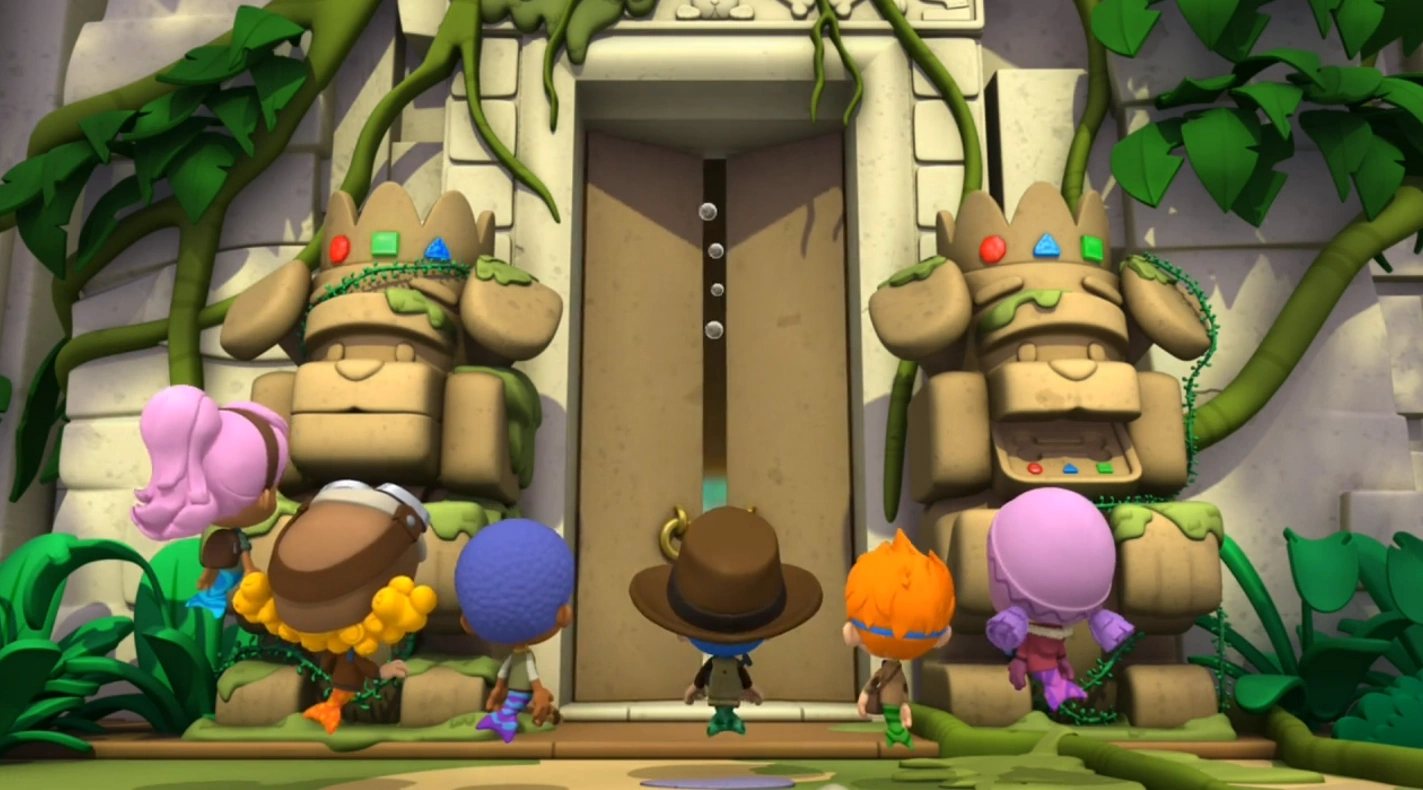 The guppies eventually reach their destination and meet Goby, an archaeologist who knows the temple better than anyone. Goby leads them into the temple as they search for the next jewel- an emerald. They discover a chamber with a big mural on the wall, where Gil finds several shaped buttons. Since the emerald they are looking for is square, they press the square-shaped button, which rotates the wall and reveals the emerald. As they take the jewel, Deema carelessly knocks over a stone statue, breaking a column and creating a domino effect which destroys the entire temple! The guppies manage to make it out in time with the treasure in hand. After placing the emerald into its slot, Nonny discovers their next destination - The Himalayas.